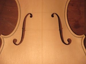 F-holes are the sound holes cut into the top plate on either side of the bridge. They need to be large enough to help sound escape from the inside of the instrument's body, but not so large that they compromise the structural integrity of the top. The stems of the f-holes need to be wide enough to easily get a soundpost through. (As a repair person I know this is essential, since I am someone who has to repeatedly do soundpost work on instruments once they are out in the world. When I have to work with a violin where the f-holes are too narrow it makes my job more difficult than it should be, so I'm mindful not to inflict the same problem on others in future.)