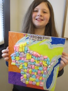 We left before they announced the awards, but I did read online this morning that Quinn's piece received the Racine Mayor's Award for the under 13 category! He created "Peepsconsin"--a county map of Wisconsin made of Peeps (that he did freehand, I might add).